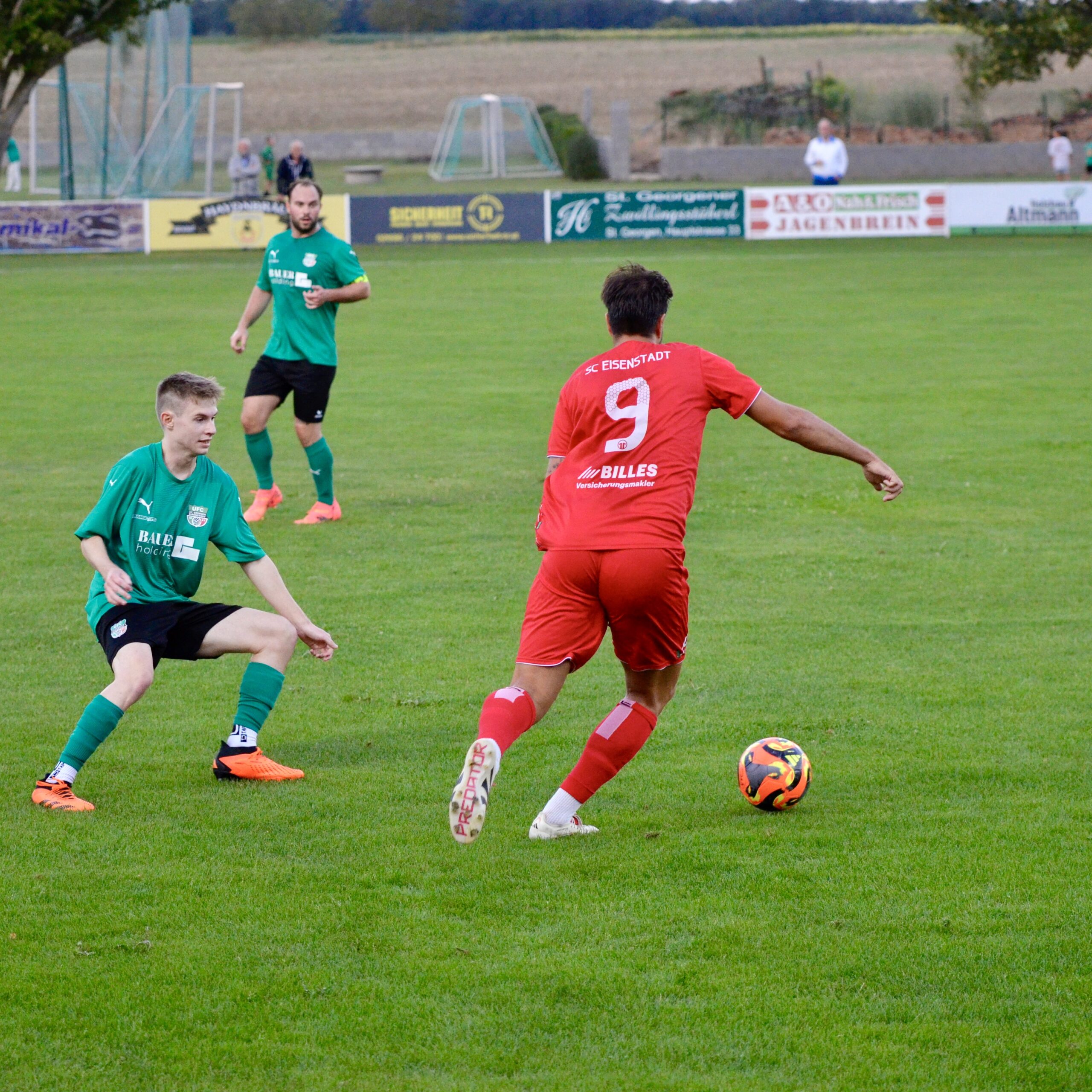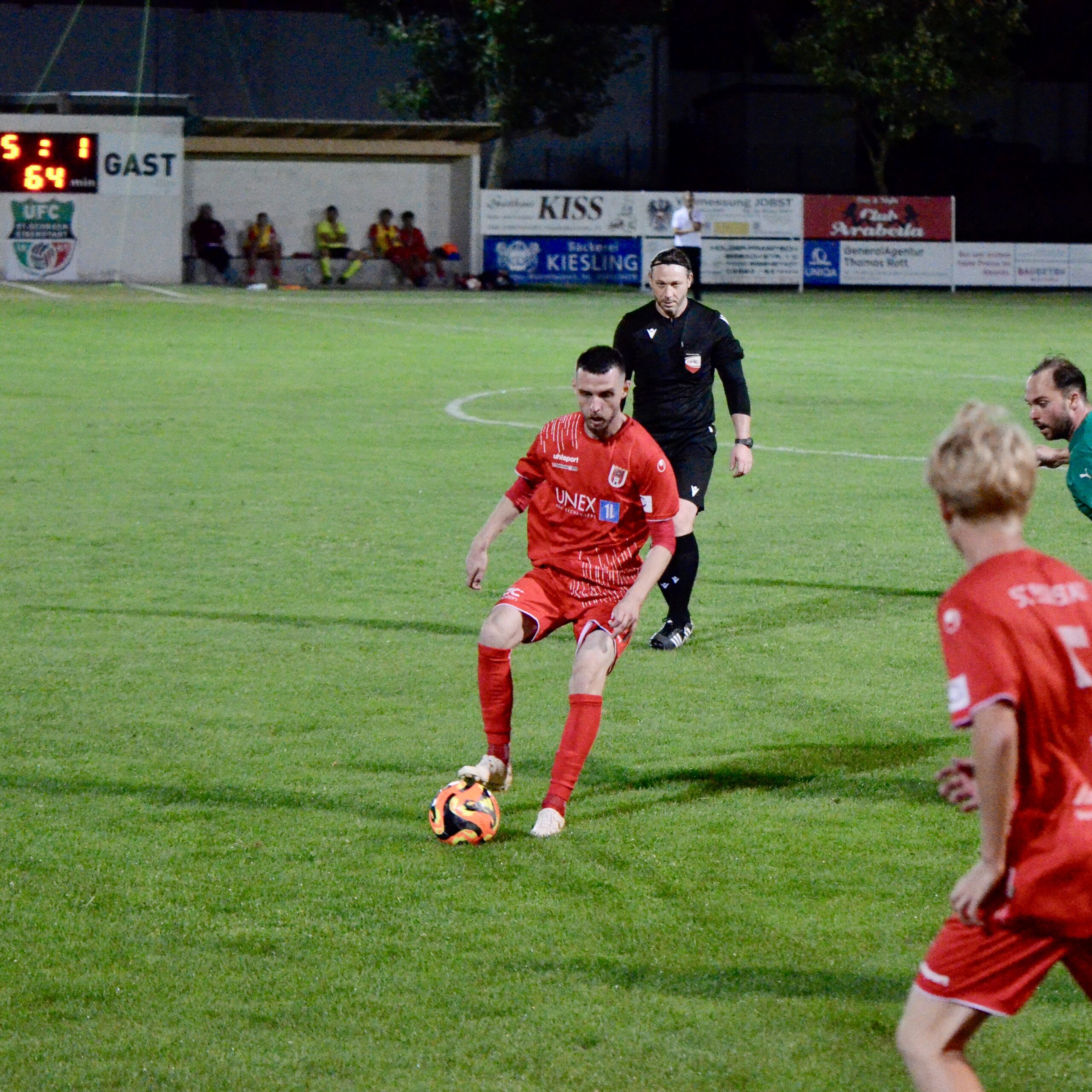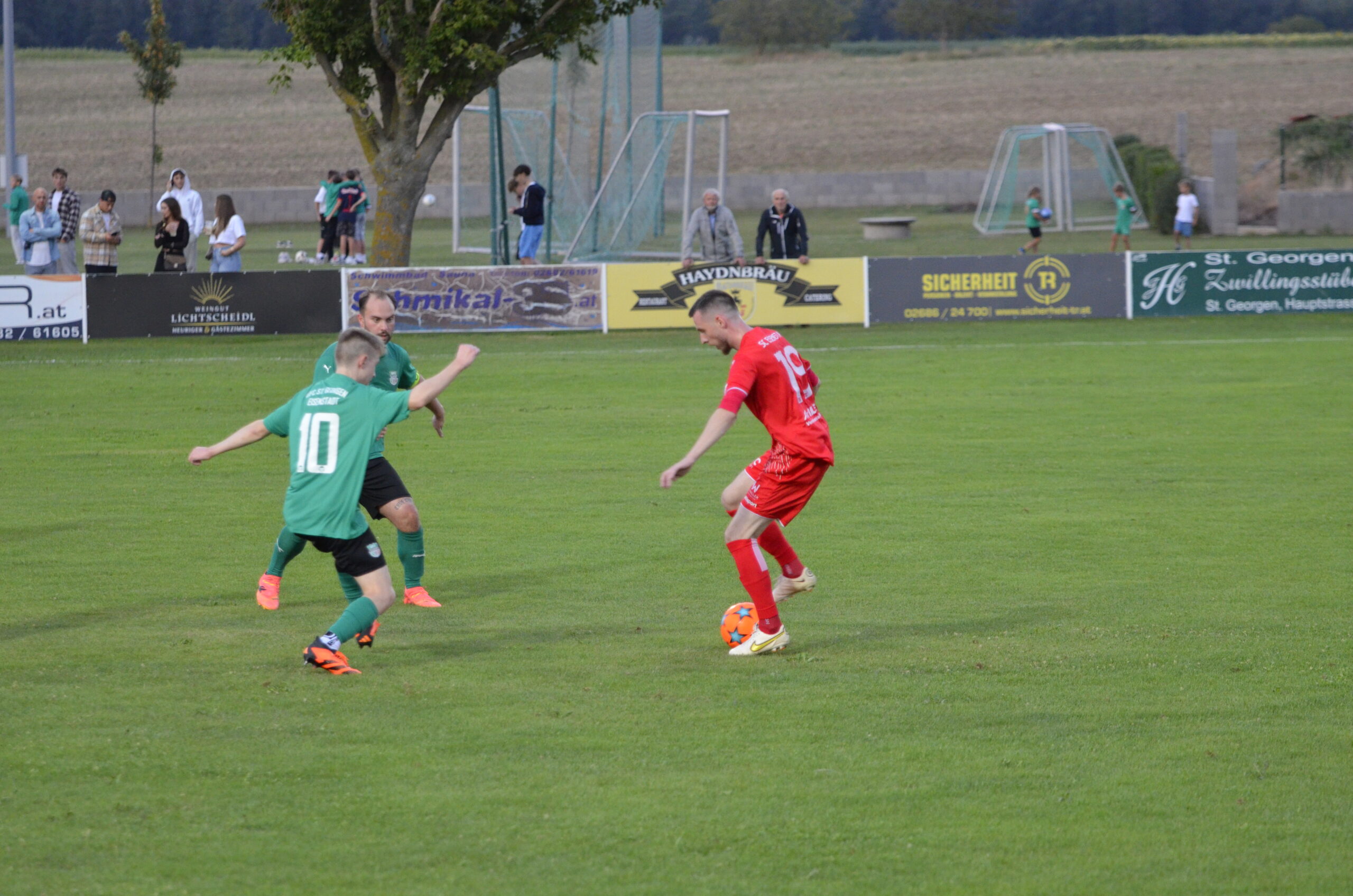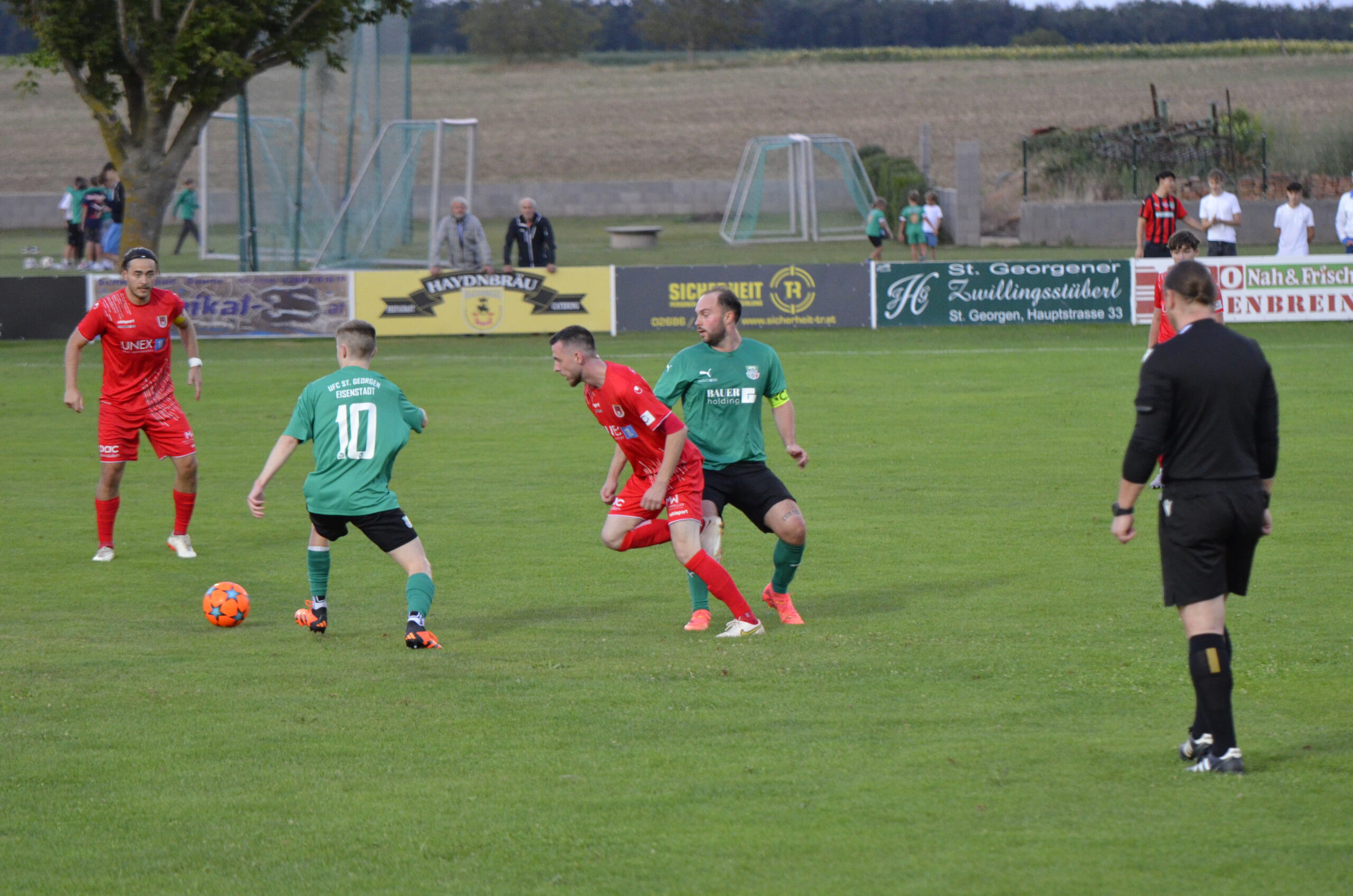Zwei Minuten später ist schon wieder St. Georgen am Drücker. Ein Weitschuss von Christopher Pinter geht aber über das Tor. In der 31. Minute gibt es dann nach einem Zweikampf an der Strafraumgrenze Elfmeter für St. Georgen. Kilian Buchreiter setzt diesen aber mit einem überhasteten Schuss an die rechte Stange. Die Freude über das verhinderte dritte Tor währt bei den SCE-Fans aber nur kurz. Schon in der nächsten Szene startet Kilian Buchreiter aus abseitsverdächtiger Position. Schiedsrichter Luef Bernhard lässt aber weiterlaufen und so fällt der dritte Treffer.
